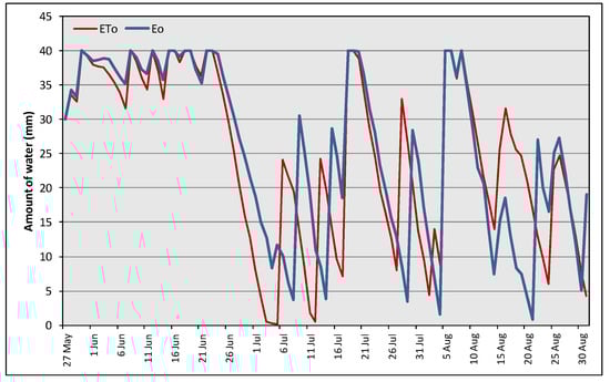 The soil–water dynamic is presented in Figure 3. After the rainy period at the beginning of the growing season, the water content in the soil was slightly depleted during the first days of July on both treatments, with a slightly lower water content on ETo. By the middle of July, two waterings were carried out, which led to an increase in the water content in the soil. A higher calculated daily water consumption on ETo caused slightly earlier watering compared to Eo. The heavy rain, followed by small frequent irregular amounts of rain, increased the water content in the soil at the beginning of August, but at the end of August, the water content was at a minimum, which caused the irrigation on the Eo variant. During the vegetation period, plants were optimally provided for both variants. The different soil content temporal patterns are associated with the different calculations of evapotranspiration between the variants.