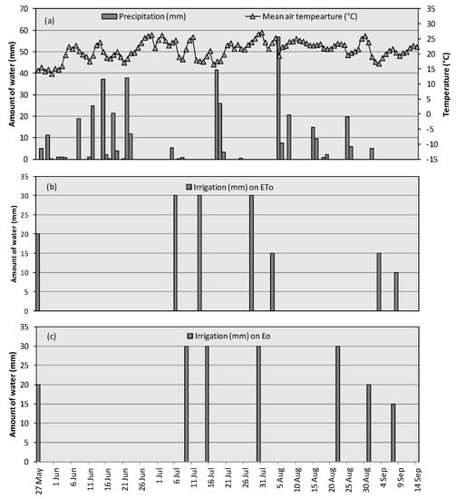 Daily weather data for the growing season (a) and irrigation water applied on ETo (b) and on Eo variant (c).