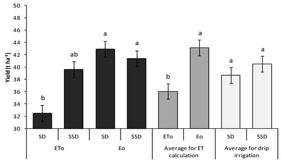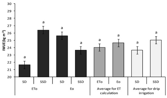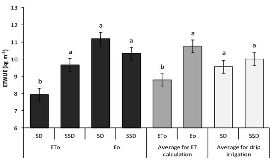 The ETWUE showed a similar pattern as yield (Figure 7), and it was influenced by the calculation of ET with higher values on Eo (10.76 kg m−3). Average values of ETWUE showed no statistical significance concerning the irrigation type (9.57 kg m−3 for SD and 10.00 kg m−3 for SSD). These values are in agreement with the results of Colak [36] for the Mediterranean region of Turkey, who reported ETWUE values from 8.6 to 12.7 kg m−3. According to Sezen et al. [40], full irrigation resulted in the lowest ETWUE, 5.5 kg m−3 compared to deficit irrigation.