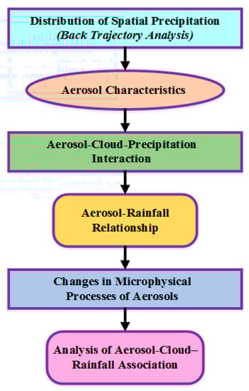 In terms of climatic factors, the interaction of aerosols–clouds–precipitation (ACP) is mainly regarded as an indirect influence of aerosols [,,]. Because this interaction is incredibly challenging and inconsistent and shows regional fluctuation, it requires a specific analysis []. Atmospheric aerosols contribute significantly to cloud formation by acting as CCNs. Consequently, the cloud albedo increases and changes in the cloud lifetime occur []. More latent heat is released and aids in the start of energetic updrafts by rainfall delay, leading to droplet freezing [,].