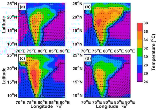 In the mature phase, temperatures of the area increase to 36 °C among sections of Eastern and Western India (Figure 2b), while regions with temperatures of 35 to 36 °C grow and spread in a comparably greater region, even up to the domain’s far west and south. Through advection, dry and hot winds appear to be as high as 26 °C among the eastern, southern, and central areas of India’s inland regions. In contrast, coastal areas observe temperatures of 24 °C (Figure 2c). However, in the western and southern regions, the thirty-year different climatic mean temperature was determined to be 21–25 °C (Figure 2d). Although climatology reveals continued development of the impacted area in this phase, in dissipating phase, the zone affected by significantly high 23 °C temperatures eventually decreases, as demonstrated (Figure 2c). During the dispersing phase, the different climatic mean temperature throughout the defined area is medium to high (31–35 °C range) between India’s south and west (Figure 2c).