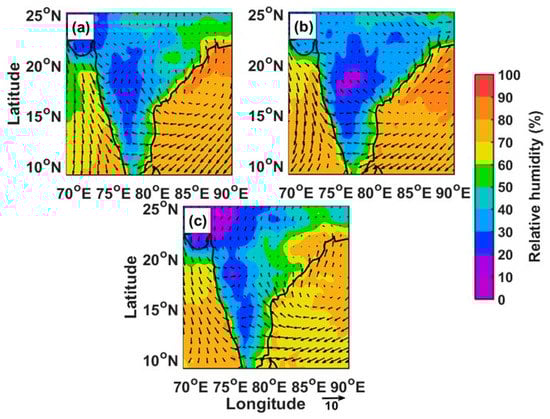 The distribution of spatial winds (m s−1) described by arrows and 1000 hPa relative humidity (%) described by colored contours associated with WDs over India between (a) (12–16 February 2016) pre-mature phase; (b) (17–22 February 2016) mature phase; and (c) (23–28 February 2016) dissipating phase. In this case, 0.25° resolution ERA-Interim data is used.