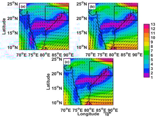 The global pattern of vertically integrated moisture transport during the 3 phases is represented in Figure 4, which is overlaid with the wind field. It is calculated in the same way as Panda et al. (2015), with 500 and 1000 hPa specific humidity and the related horizontal wind components considered. Regardless of the phases of the episode, a zone of minimal vertical moisture transfer (one–two kilogram m−2s−1) can be detected in India’s southwest to northeast regions, with half positioned between longitudes 80–90° E (Figure 4). The increased moisture vertical transport (>4-kg m−1s−1) in other places is related to higher wind variability related to the current convection activity. Convection and near-surface wind feedback loop with higher evaporation are produced by higher wind variation patterns to form improved convection. Stronger vertical winds can aid convective transport activity in coastal areas, whereas moisture is abundant.