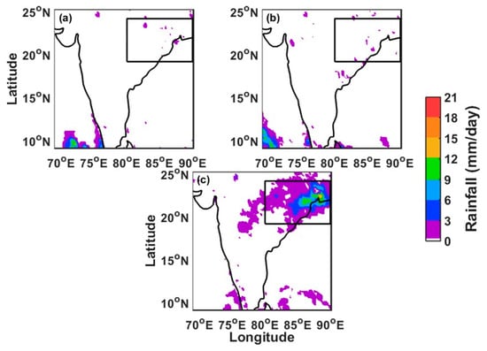 The distribution of spatial precipitation (mm day−1) of WDs over India during (a) 12–16 February 2016 (pre-mature phase); (b) 17–22 February 2016 (mature phase); and (c) 23–28 February 2016, dissipating phase. The rectangular box represents the area of (19–24° N, 80–90° E) NMVMF. The rainfall variation is depicted using TRMM data with a resolution of 0.25°.