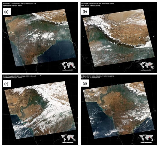 (a) Winds transport air masses under the effect of WD during the pre-mature phase (15 February); (b,c) mature phase (17 and 20 February); and (d) dissipating phase (27 February) of the WD cases on the Indian subcontinent (http://modisatmos.gsfc.nasa.gov/IMAGES/index.html accessed on 1 February 2016).