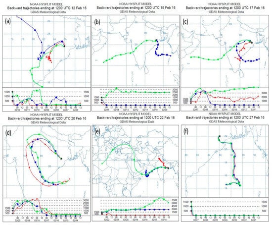 During (a) 12, (b) 15, (c) 17, (d) 20, (e) 22, and (f) 27 February 2016 of WD cases, back trajectories attaining the observation point including an altitude of 500, 1000, and 1500 m above ground level (AGL) were recorded (http://ready.arl.noaa.gov/HYSPLIT_traj.php accessed on 1 February 2016).