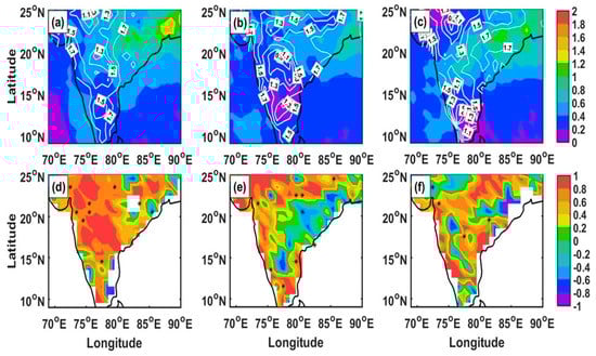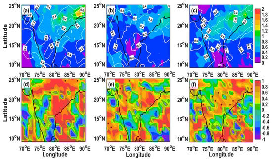Correlation coefficient (bottom row) and spatial distribution (top row) among AOD (aerosol optical depth) as well as AE (Ångström exponent) 0.412 to 0.47 over the Indian region between (a,d) (pre-mature phase), (b,e) (mature phase), and (c,f) (dissipating phase). The colored contours are for AOD, while the AE is indicated by line contours. At a 95% confidence level, asterisks indicate statistically significant datasets. MODIS data with a resolution of 1° is used in this analysis.