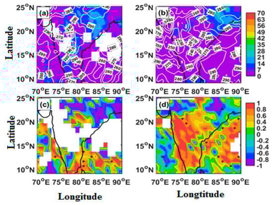 Various observational [] and modeling approaches [,] indicate that aerosols from near and distant sources, whether artificial or natural, affect daily-to-seasonal variations of monsoonal rainfall. Over monsoon regions, among numerous rainfall seasons in India, aerosol loading is significantly associated with cloud invigoration and cloud droplet effective radius, and cloud growth is suppressed through a negative association evident during periods of low rainfall []. Aerosols slow the collision–coalescence (CC) process, and they have a positive impact on the development of clouds since they are negatively correlated with CTT (cloud top temperature) and CTP (cloud top pressure) and positively correlated with the CF. As a result, monsoon rainfall rises. During the monsoon season, the number of dry days increases, and precipitation is suppressed by the influence of local aerosols in the South Asian region. On the other hand, isolated aerosols enhance the frequency of rainy episodes northwest of the Indian subcontinent [].