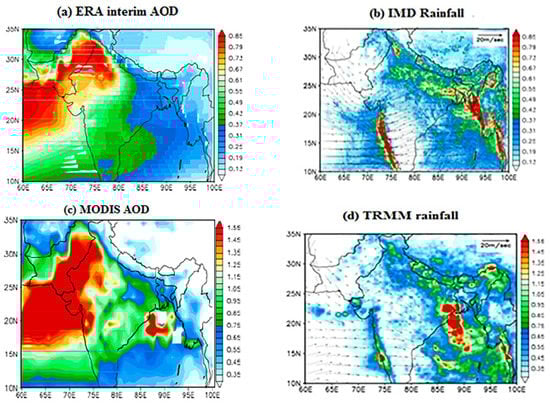Horizontal distribution of (a) from era interim AOD and (b) IMD observation of rainfall and winds (c) from MODIS and (d) from TRMM. Unit of winds in ms−1 and rainfall in mm day−1.