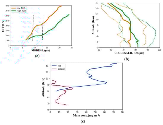 Various research has revealed that the concentration of CCN influences the warm precipitation and collision–coalescence mechanisms. The functional range of MODIS-retrieved droplets as a CTP variable was segmented into high- and low-aerosol-loading instances. It can be helpful to explore changes in warm rain processes, such as transmission and coalescence caused by the aerosol process []. Figure 12, combining MODIS and CloudSat datasets, presents microphysical cloud changes for minimum and maximum aerosol loading.