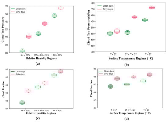 The strength of regional transients and the weather system’s intensity (climatology) achieved throughout the WDs may influence the relation between aerosols, cloud characteristics, and precipitation. Since these were most closely related to cloud parameters at the same pressure levels, to distinguish the weather influence from the aerosol–cloud–precipitation correlation (RH at 500 hPa and temperature at 600 hPa) were used. During the WD instance, the daily spatial average (RH at 500 hPa, 68.78, 17.91%) and (temperature at 600 hPa, 0.16, 0.08 Pa/s (mean, standard deviation)) among the climate for 3 WD cases. CF, CTP, and pixel-level rainfall data were collected on clean and dirty days and split into three different weather regimes. RH < 50% (low), 50%< RH < 70% (intermediate), and RH> 70% (high) are the three sub-regimes of RH. Similarly, T was used to classify the data into three convective sub-regimes: T < 17, 17 < T < 27 (weak convection regime), and T > 27 (severe convection condition) []. On clean and dirty days, the boot-strapped distribution of every sub-regime is shown in the box and whisker plot (Figure 13).