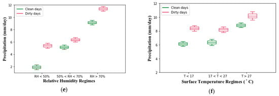 Figure 13a,b indicate that shallower clouds arose due to reduced relative humidity (RH) and downward motion (positive T). In contrast, in higher RH (CTP = 450 hPa), deeper clouds form, as well as a more robust upward surface temperature. There was a considerable difference between dirty and clean days for all three RH and T sub-regimes, with deeper clouds forming on more significant aerosol loading days than on clean days. Among the tropics is also the Amazon region [], and given the impact of a cloud of mixed-phase invigoration, which forms with a sufficient amount of aerosol, the clouds will grow taller. And this also supports our findings. Nonetheless, among dirty days, as opposed to clean days, more expansive clouds were observed in all three RH and T regimes (Figure 13c,d). The generation of extensive clouds with a more excellent CF was aided by higher RH and more robust updraft settings; with subsidence and moderate RH conditions, only a few clouds were seen. RH and T are crucial meteorological variables that alter cloud characteristics, according to this finding. Increased RH convective conditions tended to enhance rainfall, as shown in (Figure 13e,f). Furthermore, irrespective of T and RH sub-conditions, higher precipitation levels were found on dirty days compared to clean days.