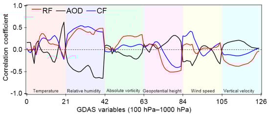 Under the influence of WD over the region, the correlation coefficients between AOD accumulated daily rainfall and CF and six weather factors. Various color variations along the x-axis represent weather parameters, like pressure values ranging from 100 to 1000 hPa (left to right). Throughout the instance of the red line, correlation testing with two variables was done in all collocated data for every level of pressure (e.g., x-axis levels of 1–21 of RF and temperature) over India for February 2016.