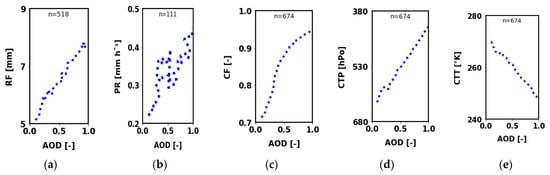 Associations of (a) daily rainfall, (b) precipitation rate, (c) cloud fraction, (d) cloud top pressure, and (e) cloud top temperature with AOD. AOD over the WDs during February 2016 was used to sort the combined data points for these five variables (a–e). Then, 50 AOD bins of “n” samples (2 percentiles) each are made using the entire number of combined data points (50 × n).