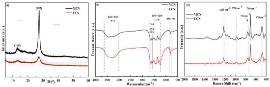 (a) XRD patterns, (b) FTIR spectra, and (c) Raman spectra of MCN and UCN.