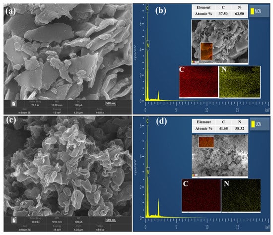 SEM was performed on MCN and UCN to study the typical morphology and detailed structure of the as-prepared samples. Figure 2a shows that MCN presents a hierarchical structure with layers stacked tightly into blocks. UCN becomes thinner and presents a more dispersed and uniform porous structure (Figure 2c). The degree of the UCN sample’s interlayer stacking structure is low, and the interlayer structure is loose, which can increase the surface area and reactive sites [51]. The results are consistent with those of BET. SEM-EDS was used to analyse the distribution and content percentage of elements on the surface of the photocatalyst. C and N are uniformly distributed on the surface of the photocatalyst (Figure 2b,d). The results of the elemental analysis of MCN and UCN are shown in Table 1. The C/N of MCN and UCN are 0.56 and 0.61, respectively.