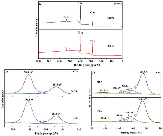 XPS was used to analyse and compare the surface elemental composition of MCN and UCN. The XPS survey spectrum shows that C and N existed in MCN and UCN (Figure 3a). The C 1s spectra are fitted into two peaks at 288.1 and 284.8 eV (Figure 3b). The primary C 1s peak at 288.1 eV is associated with the sp2-bonded carbon (N–C=N), and the peak at 284.8 eV corresponds to C–C [31]. The N1s XPS spectrum in Figure 3c displays four peaks at 398.5, 400.4, 401.3, and 404.2 eV [52]. These peaks correspond to C=N–C, ternary N (N(–C)3), N-H bond [7,46], and π-excitations [31], respectively.