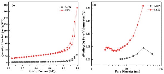 (a) N2 adsorption–desorption isotherms and (b) pore size distribution curves of MCN and UCN.