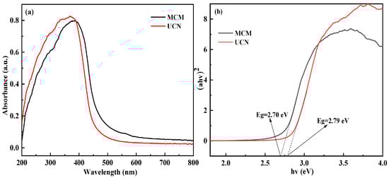 To understand the light absorption capacity of MCN and UCN, UV–vis absorption spectra were analysed, as shown in Figure 5. The sharp innate absorption edge for MCN and UCN are at around 480 and 460 nm, respectively. The absorption edge’s shift is primarily due to the porous structure’s strong quantum constraint causing the nanosheets to become thinner and smaller in the UCN [55]. The Kubelka–Munk formula was used for estimation to understand the MCN and UCN energy bands better. This is based on αhυ = A (hυ − Eg)n/2, where a, h, n, A and Eg are the absorption coefficient, the Planck constant, light frequency, a constant and band gap energy [56], respectively. The value of n depends on the type of optical transition exhibited by the semiconductor. For g-C3N4 with a direct band gap, the value of n is equal to 1 [21,57]. The Eg of MCN and UCN are 2.70 and 2.79 eV, respectively, similar to the study by Hong et al. [58].
