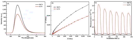 (a) PL spectra, (b) EIS plots, and (c) photocurrent responses of MCN and UCN.