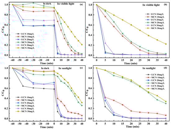 The degradation of RhB dye was used to gauge both the adsorption and photocatalytic abilities of MCN and UCN. Figure 7 demonstrates that UCN exhibits superior removal efficiency in treating RhB dye at different concentrations under visible light or sunlight, with equilibrium being achieved within 20 min. After 40 min of visible light exposure (Figure 7a), the removal efficiency of UCN towards 30 mg/L RhB dye reaches up to 99.61%, which is higher by 20.31% compared to MCN. MCN has the best effect on the treatment of RhB dye with a concentration of 10 mg/L under visible light, and the removal rate is 98.58% after 40 min of illumination, but the removal efficiency is still lower than that of UCN (99.36%). Additionally, the applicability of the prepared photocatalyst under natural sunlight was also investigated. As shown in Figure 7c, the photocatalyst UCN outperforms the laboratory-simulated visible light catalytic system by completely degrading 10 mg/L of RhB dye in 20 min. This is mostly because that natural sunlight emits not only visible light but also ultraviolet radiation, which can potentially enhance the generation of charge carriers by the catalyst and facilitate the degradation of RhB dye [61]. In order to visualise the photocatalytic degradation of RhB dyes via UCN and MCN, a degradation diagram excluding the adsorption effect was made. As shown in Figure 7b,d, under simulated visible light and real sunlight irradiation, the effect of UCN is still better after deducting the adsorption effect, which indicates the adsorption–photocatalytic synergy. In conclusion, the utilisation of urea yields superior results in the preparation of g-C3N4.