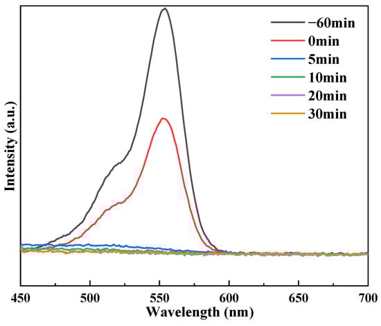 In addition, 3D EEMs technology was employed to elucidate the alterations of RhB dye after photocatalysis. Before visible light illumination, the characteristic fluorescence signal appeared at Ex/Em = 460–590/540–700 nm and 200–425/550–670 nm. After being stirred in darkness for 30 min (Figure 9a), the position and shape of the fluorescence peak remained relatively stable, but its intensity slightly decreased, indicating that the RhB molecule was only adsorbed on the catalyst without decomposition. After 40 min, the fluorescence intensity began to decrease. This indicates that the RhB has broken down into pieces and molecular fragments [62]. This is consistent with the results shown in Figure 8.