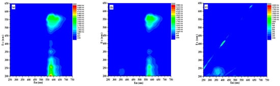 The 3D EEMs results of the RhB solution: (a) the original solution, (b) after dark adsorption for 60 min, and (c) after illumination for 40 min of UCN.