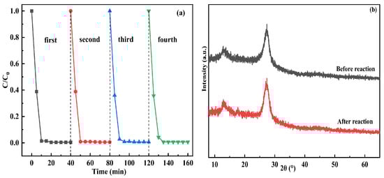 The stability and recycling properties of the UCN were verified by carrying out four cycle tests for the photocatalytic degradation of RhB dye. After each photocatalytic degradation, the powder material was extracted and recycled, cleaned three times with deionised water, and dried for the next cycle experiment. Compared with the first time (99.61%), the removal rate shows a slight change (Figure 10a). In four cycles, the treatment rates were 99.58%, 99.49%, 99.36%, and 99.35%. The results indicate that UCN exhibits exceptional stability and reusability. The photostability of UCN was further confirmed by measuring the XRD patterns of UCN after four recycling tests on RhB (Figure 10b). The XRD results show that there was no change in the crystal structure of UCN and that all the characteristic peaks are present.