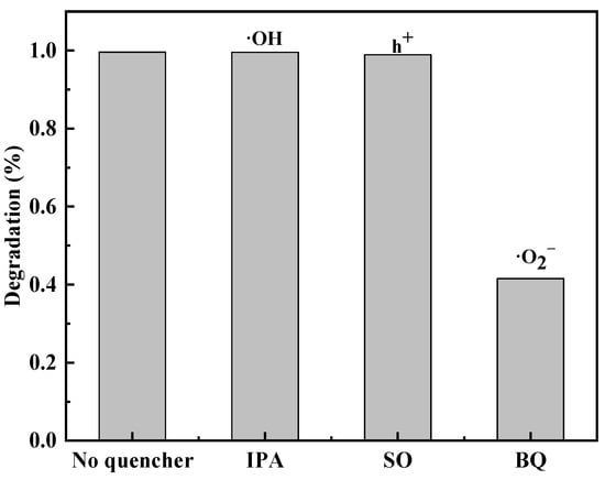 Trapping tests were conducted to study the various species implicated in photodegradation and the primarily responsible species. The primary active species of UCN photocatalytic degradation were detected by adding IPA, BQ, and SO to RhB dye as scavengers of •OH, •O2−, and h+ [43]. Figure 11 shows that the degree of removal of RhB dye (41.56%) declined significantly with the addition of BQ, while the scavenging effect of IPA (99.58%) and SO (98.53%) was weaker than that of BQ. Therefore, in the reaction process of UCN degradation of RhB dye, •O2− serves as the primary reactive species.