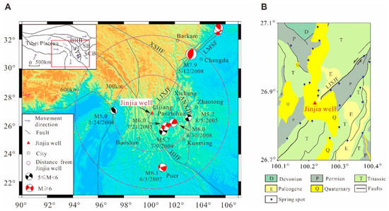 (A) Tectonic background of the Jinjia well and the distribution of earthquakes (M5.0–6.0 within 300 km, and ≥M6.0 within 600 km) from 1 January 2002 to 31 December 2009. The inset map shows the tectonic background of the study area. The elevation data were extracted from the 1 km digital elevation model (DEM) data downloaded from https://www.ngdc.noaa.gov/mgg/topo/gltiles.html (accessed on 16 October 2017). SYB: Sichuan-Yunnan Block; SB: Sichuan Basin; SCB: South China Block; LMSF: Longmenshan fault zone; XSHF: Xianshuihe fault zone; ANXJF: Anninghe-Xiaojiang fault zone; HHF: Honghe fault; LJXJF: Lijiang-Xiaojinhe fault. (B) Geologic map of the Jinjia well.