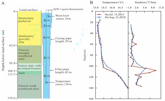 (A) Wellbore structure and sketch of the measurement system in the Jinjia well, and (B) water temperature and gradient values at different depths.