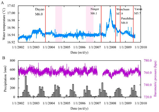Time series for the Jinjia well from 2002 to 2009 for (A) hourly water temperature (the red vertical lines indicate earthquakes with location and magnitude marked; two pink rectangles indicate the two durations of no earthquake and stable water temperature for the standard deviation calculation) and (B) hourly barometric pressure and monthly precipitation.