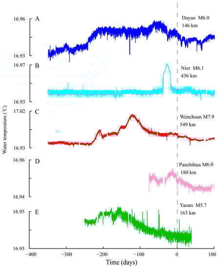The water temperature in the Jinjia well showed some abnormal increase changes from 2002 to 2009 (Figure 3A). Additionally, after these changes there were five moderate-to-strong earthquakes which occurred in the surrounding regions. No other environmental factors were found which caused the changes in water temperature. The hourly water temperature time series was plotted for 350 days before and 100 days after the five earthquakes (Figure 5).