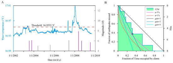 For the Jinjia well, the optimum threshold is 16.9533 °C, and the most likely time for an earthquake to occur is within 125 d, namely approximately 4 months after the water temperature exceeds the threshold. At the position of the hollow circle in Figure 6B, the fraction of time occupied by the alarm and the fraction of earthquake missed are both small, approximately 0.32 and 0.38. At this time, the number of predicted earthquakes is 5, and the predictions have a probability gain of approximately 2 and a significance level of approximately 5%, indicating a good prediction effect.
