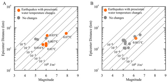 The seismic energy density was applied to the abnormal changes before the earthquakes, assuming that the impact on the observation point was positively correlated with the energy density of future earthquakes at this location (when the stress and strain gradually accumulate in the seismic source area). The analysis showed that at 130 m, temperature anomalies were observed before four earthquakes with an energy density above 10−3 J·m−3 and even one with an energy density of 4.3 × 10−4 J·m−3 (Table 1, Figure 7A). At 135 m, for the five earthquakes with seismic energy density above 10−3 J·m−3, only one preseismic water temperature anomaly was recorded (Figure 7B and Figure 8A).