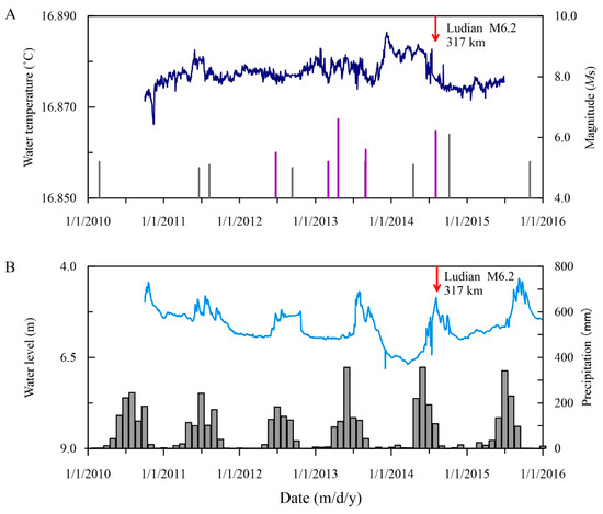 Time series of the Jinjia well for (A) water temperature and (B) water level (blue line) and monthly precipitation (grey bars). The vertical lines represent earthquakes around the well (M5.0–6.0 within 300 km and ≥M 6.0 within 600 km), with the purple lines representing the earthquakes with a seismic energy density ≥10−3 J·m−3. The red arrow represents the Ludian M6.2 earthquake on 3 August 2014.
