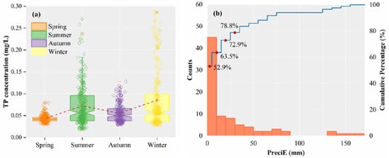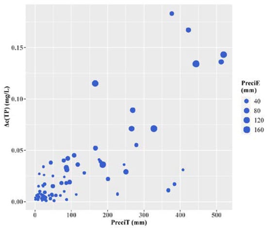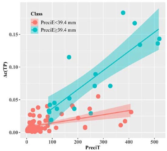 - The effect of precipitation on river TP concentrations is not consistent. The breaking point of PreciE (ε) is 39.4 ± 0.45 mm. This nonlinear relationship is inferred to be caused by the transformation of the primary streamflow production pattern;