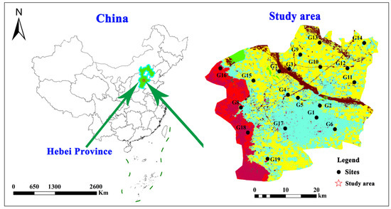 The Shijiazhuang section of the Hutuo River alluvial fan (with an area of about 1500 km2) is located in the piedmont inclined plain area at the eastern foot of Taihang Mountain in Hebei Province, China (Figure 1). The study area has a permanent population of approximately 5.2 million and a cultivated land area of about 60 × 104 hm2. This region has distinct seasons and belongs to a semi-humid and semi-arid continental monsoon climate. The average annual precipitation is about 550 mm/yr which is unevenly distributed over time, mainly concentrating between April and September, accounting for 70% to 80% of the annual precipitation. The annual evaporation ranges from 1600 mm/yr to 2100 mm/yr, and the average annual temperature is 13.0 °C [20].