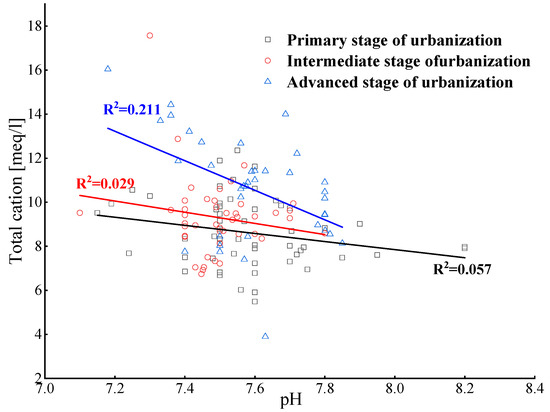 The pH of groundwater in the study area ranges from 7.18 to 8.20, with an average of 7.56, and shows a neutral to weak alkaline water. This is closely related to the formation lithology (limestone is the main rock type in this area) and the over-extraction of groundwater (which results in more salt-based ions being present in groundwater) [23]. The pH fluctuations of different monitoring stations within different urbanization stages are small, meeting the WHO drinking water standard (between 6.5 and 8.5) [24]. The average pH values for the three development stages (PSU, ISU, and ASU) are 7.56, 7.52, and 7.50, respectively, showing no significant changes. Meanwhile, there is an inverse relationship between pH and major cation concentrations (Figure 2). This may be related to the carbon dioxide emissions from industrial and agricultural activities entering groundwater through precipitation infiltration, leading to a decrease in the pH value and an increase in cation concentration.