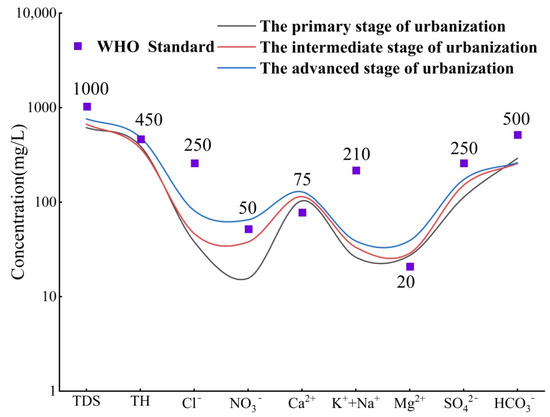 We analyzed the characteristics of the primary ion components in groundwater during the three urbanization stages based on a semi-logarithmic plot (Figure 3) and Supplementary Table S2. As seen in Figure 3, the concentration of major ions in groundwater increases with urbanization, and reaches the highest value during the AUS. This indicates that frequent human activities have a strong impact on the chemical composition of groundwater [25]. During the PSU, ISU, and ASU, the Ca2+ concentrations are 103 mg/L, 114 mg/L, and 128 mg/L, respectively, all exceeding the WHO water quality standard [26]. This may be related to the lithology of the strata in the study area and long-term over-extraction [27]. In addition, the concentrations of TH (485 mg/L) and NO3− (65.1 mg/L) in the ASU also exceed the WHO water quality standard. The high concentration of TH is mainly due to the continuous increase in Ca2+ and Mg2+ concentrations, while the excessive NO3− level is mainly related to human activities [28]. Previous studies have found that NO3− in groundwater in the Hutuo River Basin mainly comes from domestic sewage and chemical fertilizers [14].