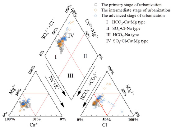 Piper trilinear diagram of groundwater in different stages of urbanization.