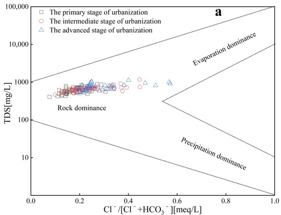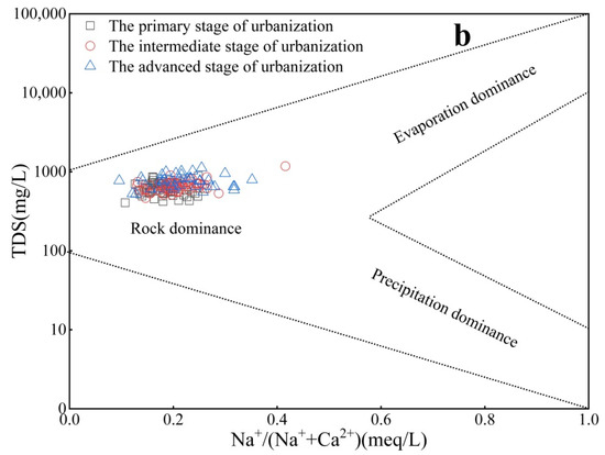 Gibbs diagrams for groundwater in different stages of urbanization ((a) Cl−/[Cl− + HCO3−] vs. TDS; (b) Na+/[Na+ + Ca2+] vs. TDS).