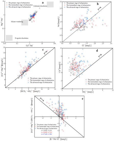 Relationships between major ions for groundwater samples in different stages of urbanization (a) (Ca2+/Na+) vs. (Mg2+/Na+); (b) Cl− vs. Na+; (c) [Ca2+ + Mg2+] vs. [HCO3− + SO42−]; (d) SO42− vs. Ca2+; (e) [Na+ + K+-Cl−] vs. [Ca2+ + Mg2+-HCO3−-SO42−].