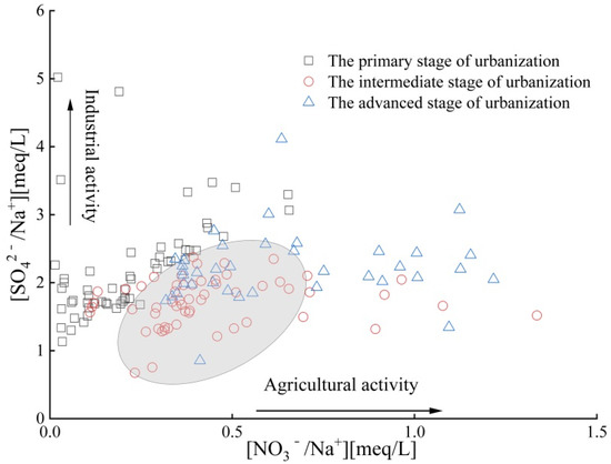Variation relationship of SO42−/Na+ and NO3−/Na+ in different stages of urbanization.