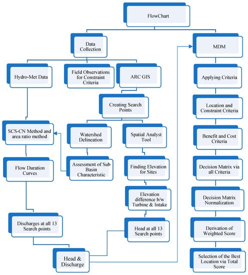 Multi-criteria decision-making (MDM) is used for screening, prioritizing, selecting, or ranking the alternatives, and relies on the human assessment of a finite number of options according to a number of competing standards. The steps involved in MDM follow the sequence of (1) the selection of criteria; (2) the estimation of location criteria; (3) the normalization of location and constraint criteria; (4) assigning the weights to individual criteria; (5) the final Ranking of suitable sites based on the weighted average score; and (6) the estimation of hydropower potential and plant factor and conclusion.