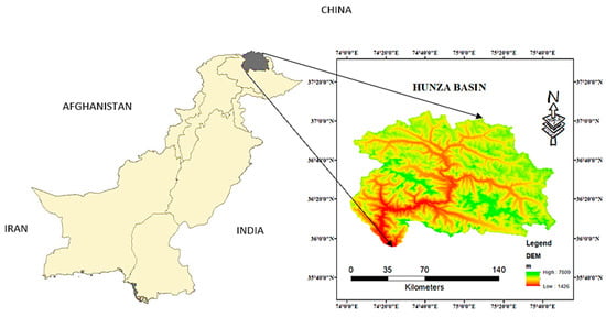 The study area, i.e., Hunza River basin (36.31° N, 74.64° E), as shown in Figure 2, is located in the mountainous valley in Gilgit-Baltistan, Pakistan, and has a basin area of 13,733 km2 with a 231.76 km total length of the river. Several medium- and small-sized perennials as well as non-perennial tributaries cum rivers, and streams, such as Chalt, Daniyor, Chupurson, Khyber, Khuda_abad, Khunjeraab, Hisper, Hassanabad, Misgar, Hoper, Nalter, Rakaaposhi, Verjerab and Shimmshal, contribute to the flow of Hunza River, making its mean annual flow 323 m3/s. The Hunza River basin joins the Nalter River and the Gilgit River before it falls into the mighty Indus River [4].