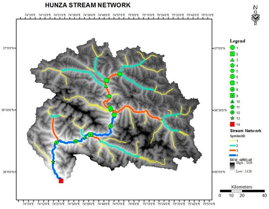 Hence, keeping in mind the possibility of hydropower potential in the Hunza river basin, the current study focuses on the identification of suitable sites in Hunza district, Gilgit-Baltistan, Pakistan. To conduct the identification of potential sites, the flow data were collected from the Surface-water Hydrology Project of Water and Power Development Authority (SWHP-WAPDA) of Pakistan for a period of 55 years (1960–2015) at Daniyor Bridge and for a period of 20 years (1995–2015) at Shimshal and Passo tributaries. The meteorological data of four available stations, i.e., Khunjerab, Naltar, Passo, and Khunjerab were obtained for the assessment of flow at different sub-basins. Moreover, the open-access Advanced Spaceborne Thermal Emission (ASTER)’s 30 m Digital Elevation Model (http://srtm.csi.cgiar.org) (accessed on 28 July 2018) was used for GIS-based DEM processing and the estimation of elevation, area and available head and different proposed sites.