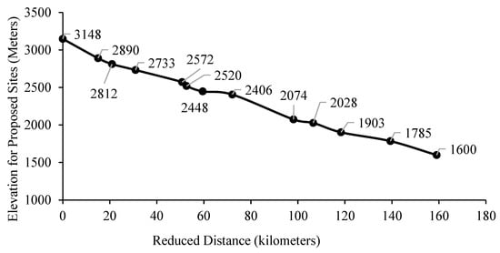 For assessment of the head at the marked thirteen sites, the elevations of both the proposed dam/weir and powerhouse locations were derived using DEM processing with the spatial analyst tools of GIS. The derived profile of the Hunza River is graphically represented in Figure 4 by using the derived elevation of each site against the reduced distance (RD) along with the derived river profile of Hunza River with respect to the elevation of the intake point of the proposed sites. The RD was taken from the upstream to downstream of the river in such a way that site one (1) was considered RD 0 km and so on.