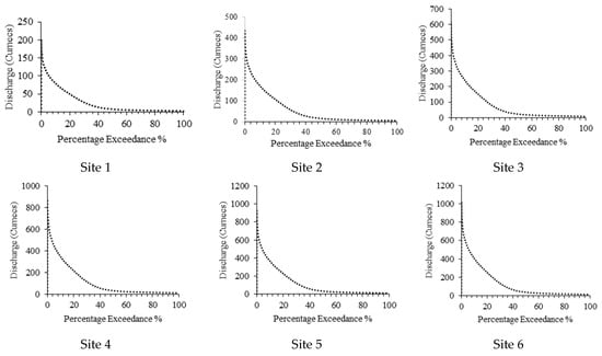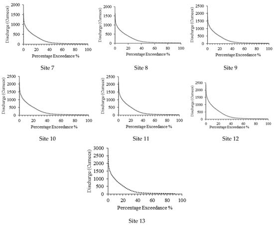 As the accumulation of flow increases from upstream to downstream, site 13 has the highest value of discharge, while site one (1) has the lowest value of discharge. Furthermore, the discharge values at each site were used to develop flow-duration curves, as shown in Figure 6.