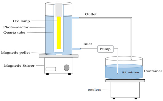 In the present research, HA degradation was examined through the synthesis of a magnetic nanocomposite. To assess and determine the optimal conditions, the impact exerted by all crucial variables on the photocatalytic degradation of the HA was studied. The variables included pH (i.e., 3, 5, 7, 9, and 11), photocatalyst dose (0.005, 0.01, 0.02, 0.03, 0.04, 0.05, and 0.1 g/L), HA concentration (i.e., 2, 5, 10, and 15 mg/L) and contact time (i.e., 5, 10, 15, 30, 60, and 90 min). A schematic representation of the photocatalytic reactor is shown in Figure 1. The HA residual concentration in the photocatalytic reactor was determined by evaluating its absorption at 260 nm. To study the adsorption–desorption reactions between the HA and BNTN@Fe3O4@ZnO magnetic nanocomposite, the container in which the HA and photocatalyst were present was maintained in darkness for 30 min before it was exposed to the UV beam. A cooling system was installed to maintain the liquid temperature inside the main tank at 24 ± 2 °C. Finally, the equation provided below was applied to assess the performance of the photocatalytic reactor in the HA removal process.